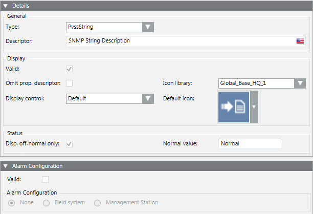 NOTE: The Alarm Configuration settings cannot be used for String DPE types as String properties cannot generate events.