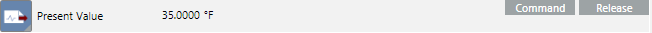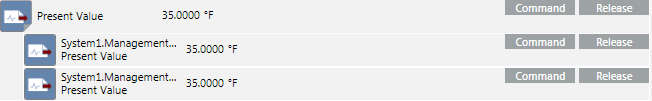 If you select multiple objects of the same type, for example, Analog Output, the icon next to the property name indicates this with a triangular symbol in the lower right-hand corner. Clicking this symbol expands the table row to show all of the selected objects of the same type that share this property. You can then change (command) all Present Value properties for the selected objects at the same time. You can command a maximum of 250 objects.