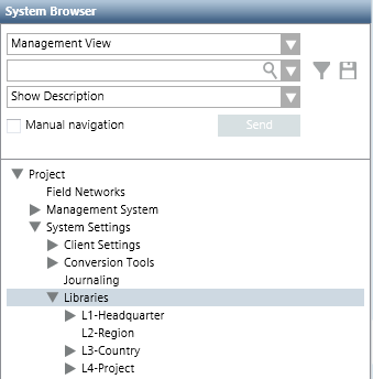 All the libraries available in Desigo CC are located under Project > System Settings > Libraries in Management View.