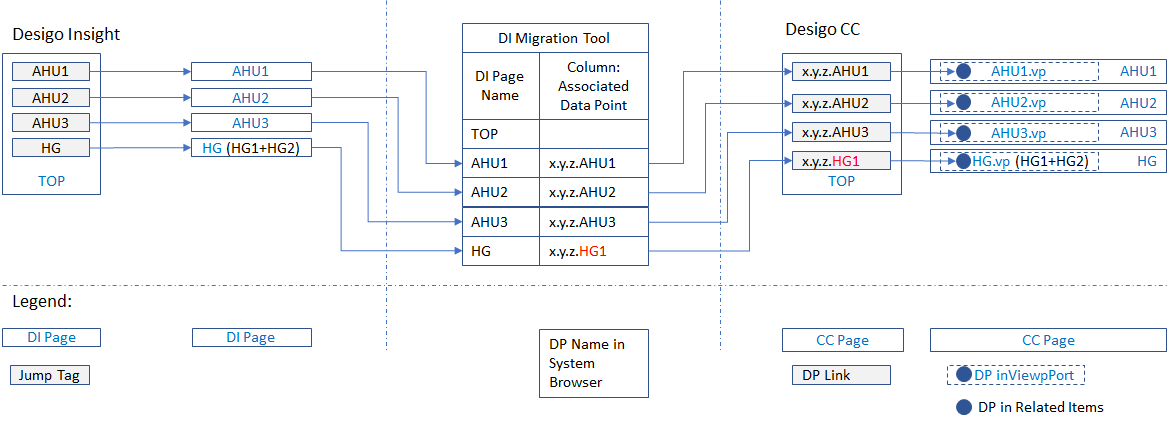 In Desigo Insight, the jump tags with references of file names to the graphic page are set, for example AHU1. A corresponding data point reference must be assigned from the Logical View in order for navigation from a Desigo Insight jump tag operates as well in Desigo CC, for example: x.y.z.AHU1. This reference is required in viewport as well as in the Related Items tab for the corresponding graphic. You only need to assign one data point reference if multiple partial plants, for example HG1 and HG2, exist on a graphic page.