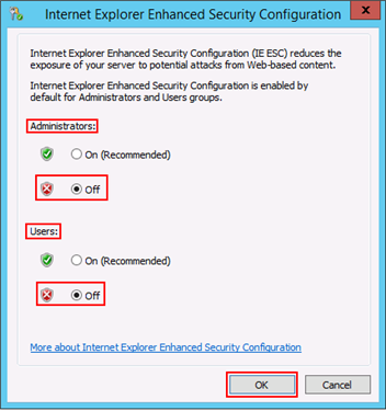 - For Administrators and Users, set the IE ESC Off.
