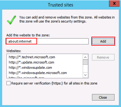 Solution 1: Add the about:internet Site to the Trusted Sites Zone