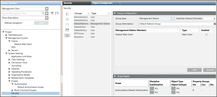 Cause 1: When you run an Advanced Report in the Application Viewer you are actually running it under the Default Web Client with its assigned scope and application rights. This applies also to the Configuration Page. In the case of the HQ TBS, BA and FS project templates the Default Web Client is associated with the DefaultStations security group. This Management Station Security Group uses the Default Authorization Scope and reduced Application Rights to restrict the rights when accessing the project with a Web Client. In the case of HQ TBS, BA and FS project templates, the Application View , for example, is excluded. This is why the system denies the Default Web Client access to this View.