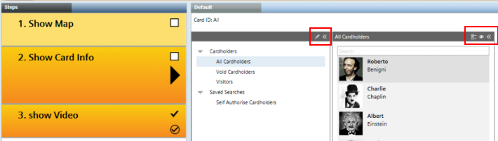 NOTE: The cardholder information and all-cardholders views are provided for read-only purposes in the Desigo CCAssisted Treatment step, and any commands visible there (such as those marked in red above) are not supported.