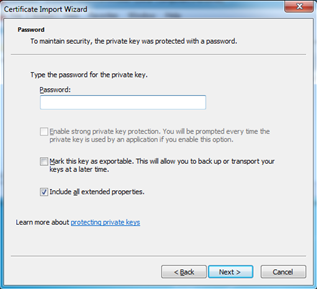 NOTE: If you created the pfx using the self-signed procedure, the password field is blank, and you can leave it blank.