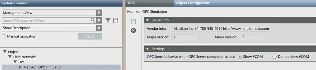 In Engineering mode, when select a third-party OPC server in System Browser imported under an OPC network, in the OPC tab you can view the server info, configure the behavior in case of connection lost (see Modifying the Behavior for Connection Lost), or remove it (see Deleting an OPC DA Client Configuration).