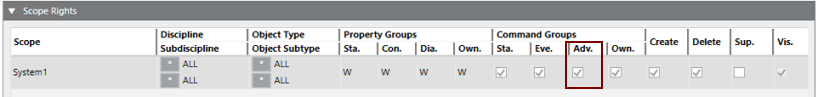 3. In the Scope Rights expander, under Command Groups, clear the Adv. flag.