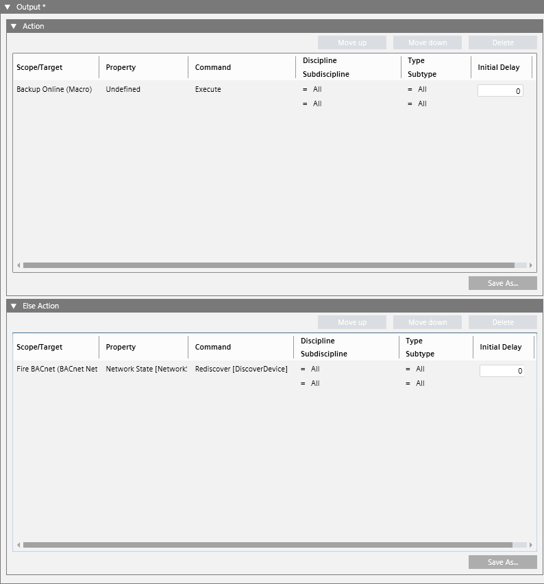 1. In the Reaction Editor tab, open the Output expander. Here you can configure what commands will be executed when the reaction is triggered (Action). You can also optionally configure commands to execute when it is not triggered (Else Action). For details, see Output Instructions of a Reaction.