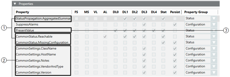 Mandatory properties required for Desigo CC SNMP components to work correctly. They are the result of the import of the line *;CommonStatus;Ref;_GmsSNMP_CommonStatus;defined in the CSV file.
