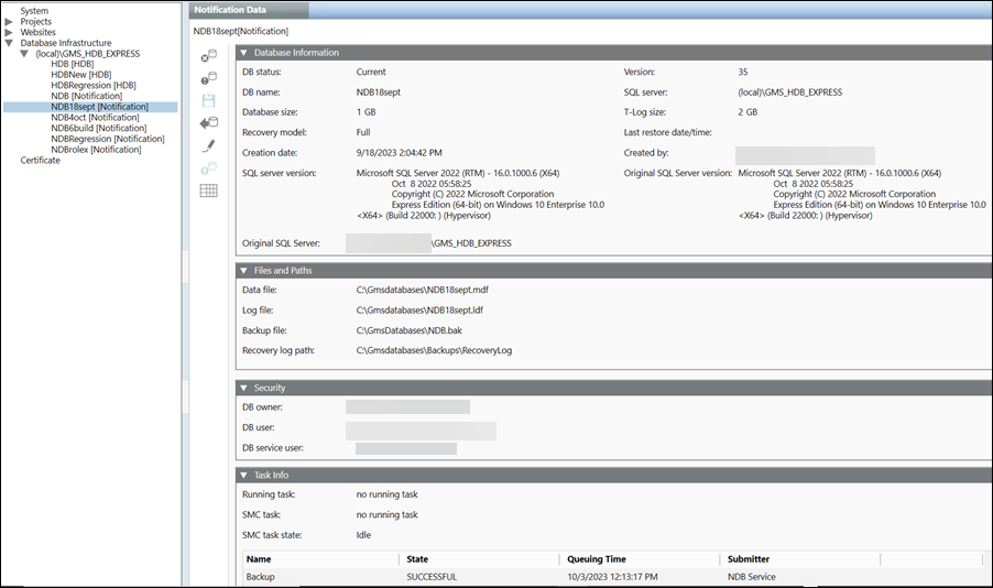 • Backup file: C:\Gmsdatabases\Backups\NDB.bak