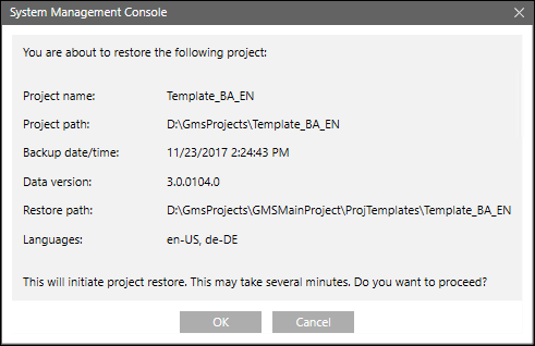 Using SMC, you can restore a project/project template only on a Server. During the restore process, the SMC internally checks if the backup selected for restore is compatible with the current Data version or if it needs an upgrade.