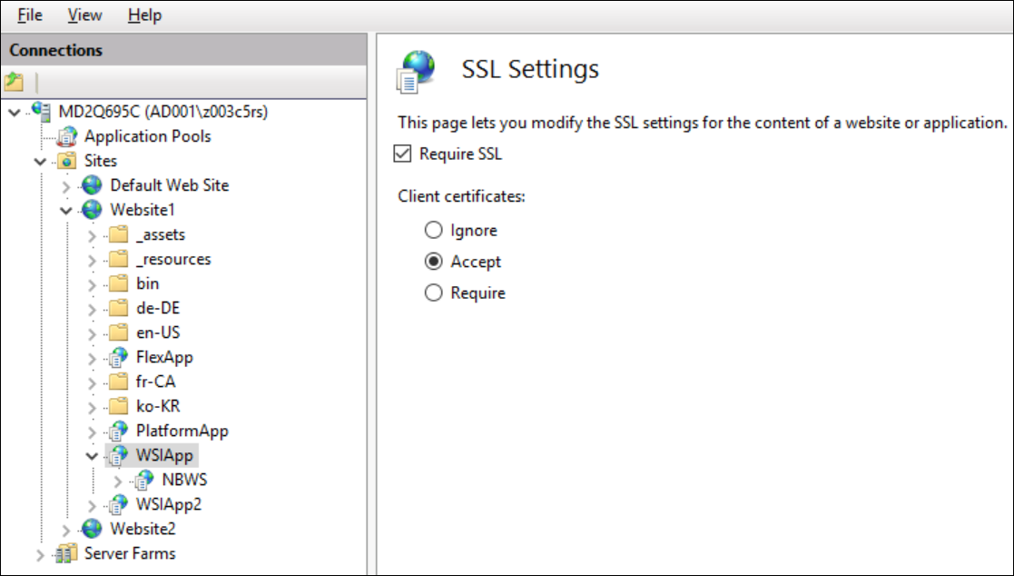 Require SSL + Accept Client Certificate | No certificate popup displays and no client identification possible. WSI communication will remain secure. | Certificate pop-up displays with all certificates installed and having the private key. In this case, certificate should be selected and a private key is necessary for Client Identification otherwise client will be treated as anonymous. WSI communication will remain secure. | Server and a Remote Web Server (IIS) |