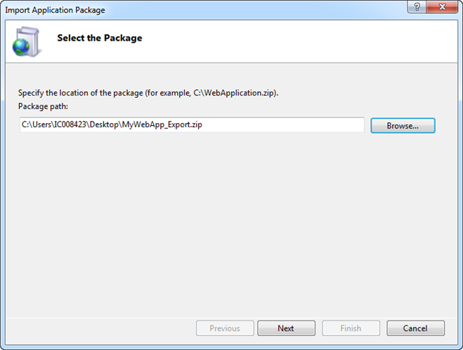 5. Browse for the exported web application zip file on the target machine and click Next.