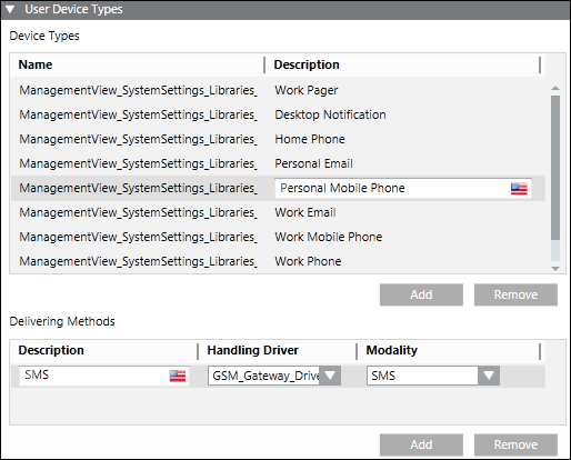 1. The user device type is automatically configured. In the Recipient Editor tab, under the User Device Types expander, you can see that the GSM Gateway Driver is set as the handling driver and modality is set as SMS.