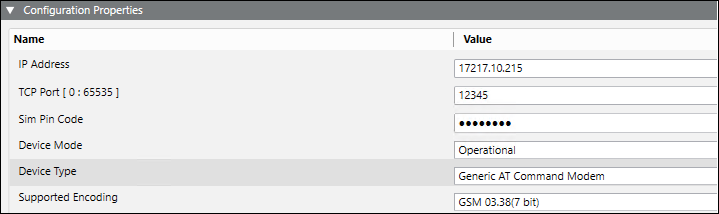 8. In the Configuration Properties expander, proceed as follows (For more information refer to the IP Modem Device section in Notification Supported HW/SW Device Configurations Guide):