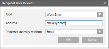 1. In the Recipient User Devices dialog box, from the Type drop-down list, select Personal Email or Work Email as a recipient device for the corresponding recipient user.