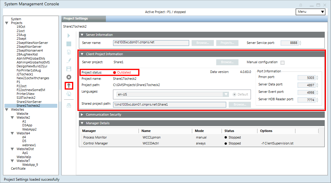 NOTE: If you have changed the Server project parameters, you must realign the Client/FEP project with the linked Server project. Otherwise, the Client/FEP - Server project communication does not work.