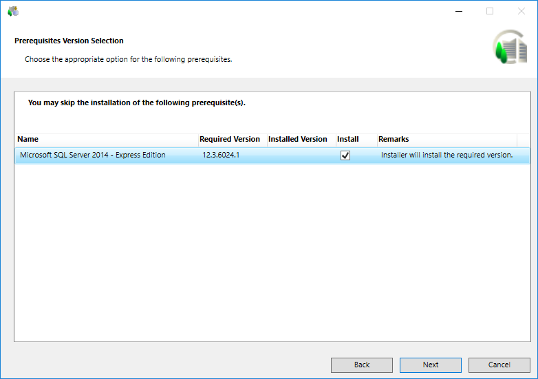 The Prerequisites Version Selection dialog box displays listing the required versions of the installed prerequisites only when the tag <AutoResolvePrerequisiteConflict> in the selected GMSPlatform.XML is configured as False. NOTE 1: By default, it is recommended to install the prerequisite Microsoft SQL Server 2022 - Express Edition. If you want to use another SQL server, you can skip it. However, the three prerequisites, Microsoft SQL Server 2012 - Native Client, Microsoft SQL Server 2016 - System CLR Types, and Microsoft SQL Server 2016 - Management Objects are installed on the server in this given order. Installing these prerequisites, helps create an HDB remote server using SMC, when no SQL exists on the server. NOTE 2: If the compatible higher version of SQL is already installed on your computer, by default, the Installer skips (the Install check box is not selected) the installation of the lower version of SQL. NOTE 3: During the Client/FEP installation, the Prerequisite Version Selection dialog box only displays when there is any conflict with the installed prerequisites in the system. It lists the required versions of the installed prerequisites and recommends installing the required version, if the installed version is not compatible. NOTE 4: You can also use the modified GMS Platform.xml file, where the SkipInstallation section is enabled to skip the installation of Microsoft SQL Server 2022 - Express Edition. Even if you skip, the three prerequisites, Microsoft SQL Server 2012 - Native Client, Microsoft SQL Server 2016 - System CLR Types, and Microsoft SQL Server 2016 - Management Objects are installed on the server in this given order.