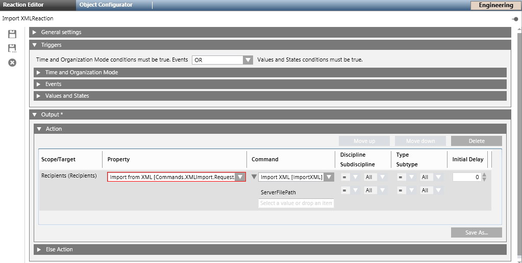 - Click Save As and enter the name and description for the Import XML reaction.