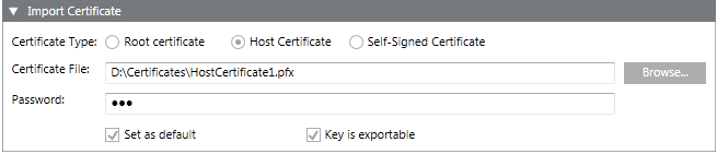 , the Import Certificate expander displays. It allows you to select a root, host or self-signed certificate from the specified location on the disk and import it in the appropriate Windows store.