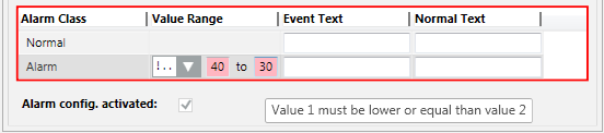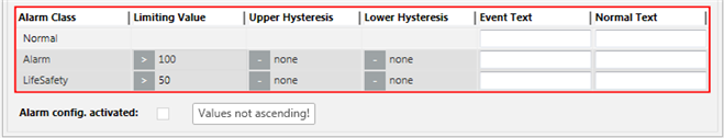 - To modify or configure an alarm class, click in a table column to change the corresponding setting. For example, Alarm Class, or Skip alarm generation. See below for the meaning of the operands.