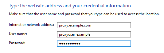 - The “Internet or network address” defined here must match the proxy address defined in the previous section, and the username and password should be your proxy server authentication credentials. Do not include the scheme/protocol (for example, “https…”) in this field either.